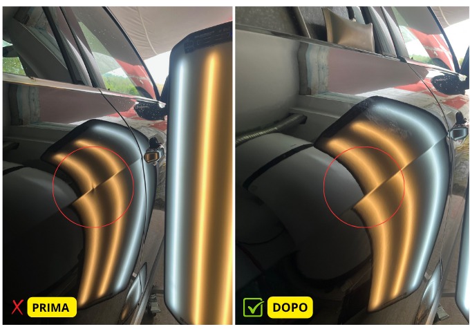 Intervento eseguito: levabolli con tecnica PDR (Paintless Dent Removal), senza riverniciatura. Ripristinata la forma originale del pannello in meno di 2 ore.